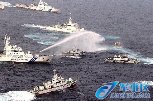 日本巡视船发射水炮拦截台湾保钓船。
